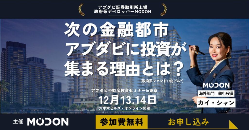 【BITEX×MODON共催】アブダビ不動産 販売説明会とは 概要 アブダビ政府系デベロッパー MODON社 と、日系唯一のアブダビ不動産ライセンス保有会社 BITEX が共同で開催する販売説明会です。 今回の販売説明会は、アブダビ政府系デベロッパー MODON社 が2025... -