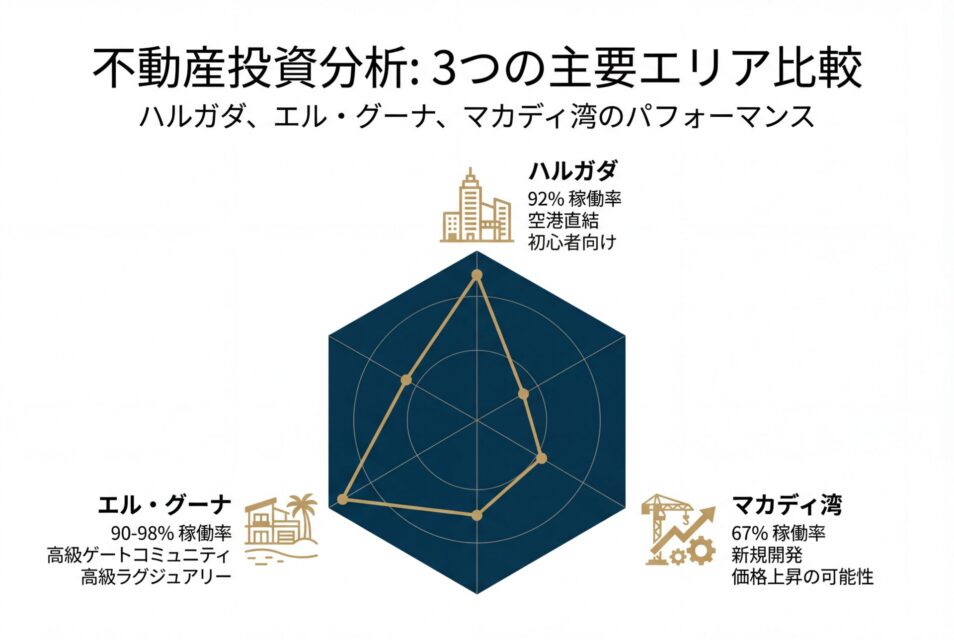 短期賃貸収益を最優先する場合は、ハルガダ市内の空港近接エリアやビーチフロント物件が適しています。稼働率の高さと観光客へのアクセス利便性が、収益性を左右する主要因となります。