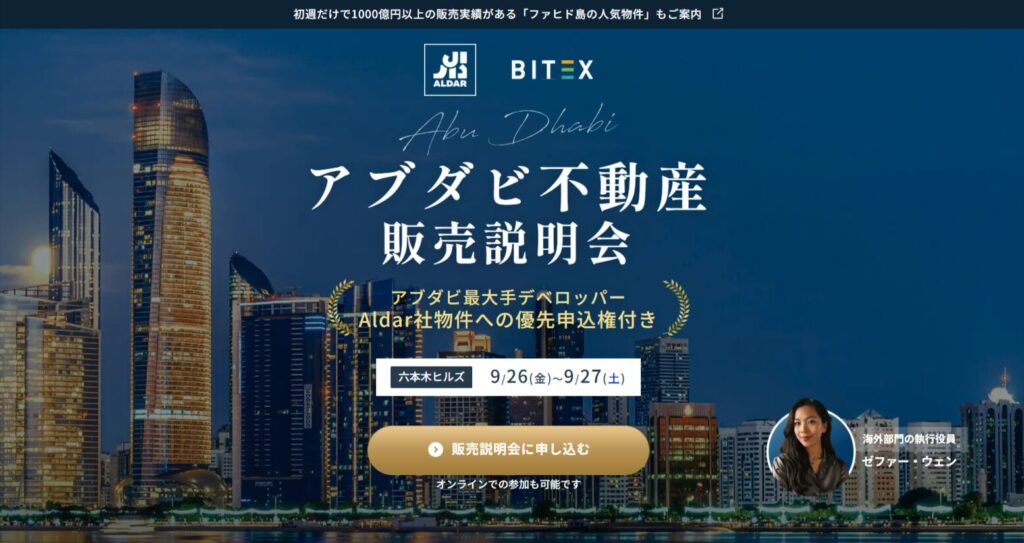 【BITEX主催】アブダビ不動産 販売説明会とは 概要 アブダビ最大手デベロッパー ALDAR Properties と、日系唯一のアブダビ不動産ライセンス保有会社 BITEX が共同で開催する販売説明会です。2025年9月26日(金)・27日(土)東京・六本木ヒルズにて、最新... -
