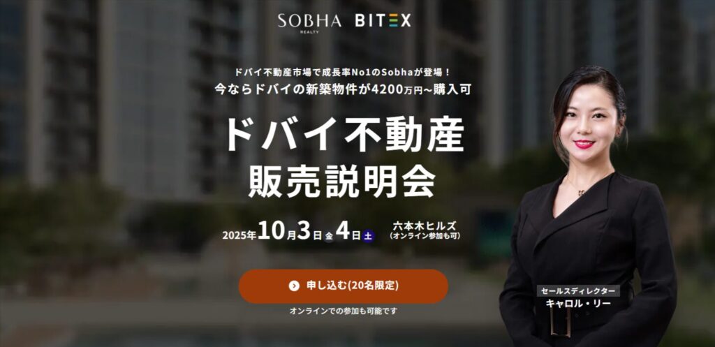 【BITEX主催】ドバイ不動産 販売説明会とは 概要 ドバイ不動産市場で成長率No1のSOBHA Realty と、日系唯一のドバイ・アブダビ不動産ライセンス保有会社 BITEX が共同で開催する販売説明会です。SOBHAが手がける最新のドバイ高級レジデンスプロジェクトを... -