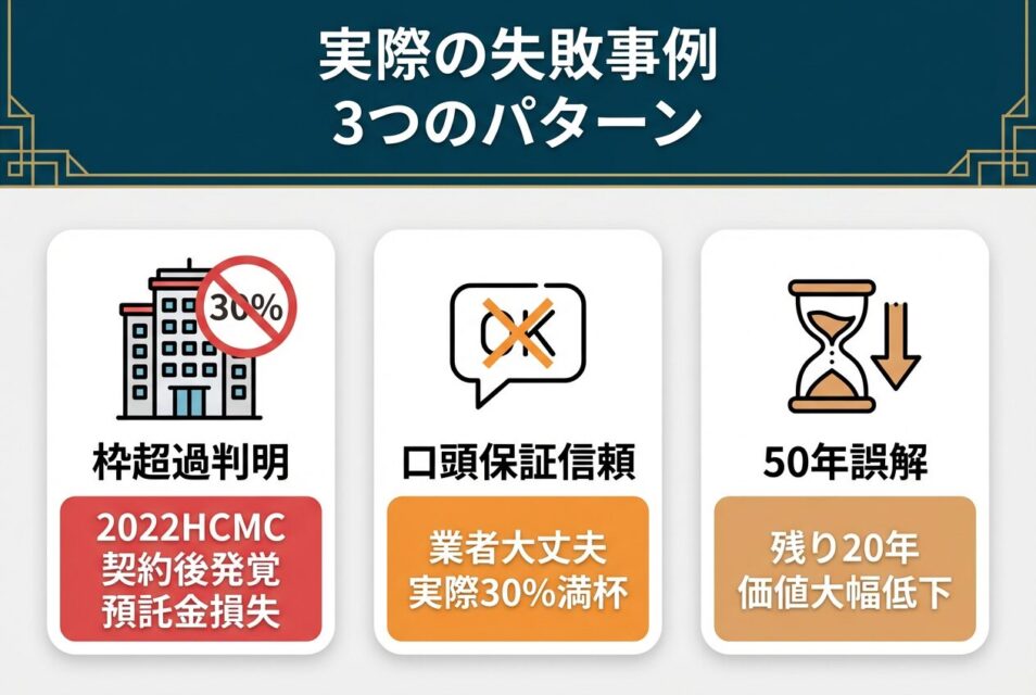 2022年にホーチミン市で日本人投資家の知人が外国人所有枠超過により購入を断念し預託金を失った事例があります。
