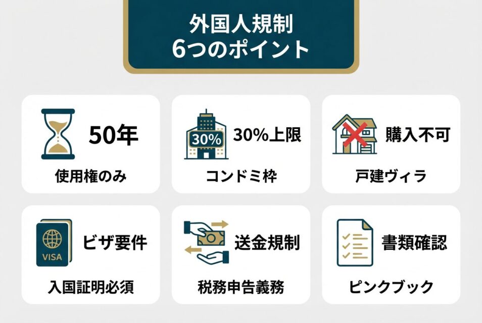 外国人が購入可能な不動産は、商業住宅開発プロジェクト内のコンドミニアム(1棟あたり30%の外国人枠制限あり)、および登録された商業・観光開発プロジェクト内の個別住宅(1プロジェクトあたり最大10%、行政区画内合計250戸まで)です。