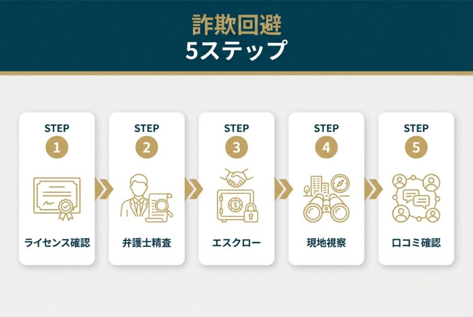 詐欺リスクを最小限に抑えるためには、以下の5つのステップを必ず実行してください。特にステップ1と2は契約前の必須事項です。