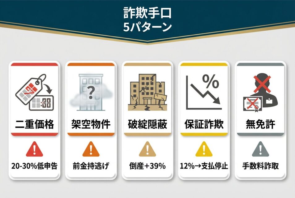 外国人投資家を狙った詐欺は、主に5つのパターンに分類されます。それぞれの手口の特徴を理解し、契約前に必ず確認しましょう。